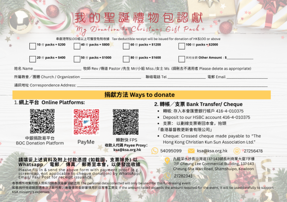 - 支票: 以劃線支票寄回本會,抬頭「香港基督教更新會有限公司」